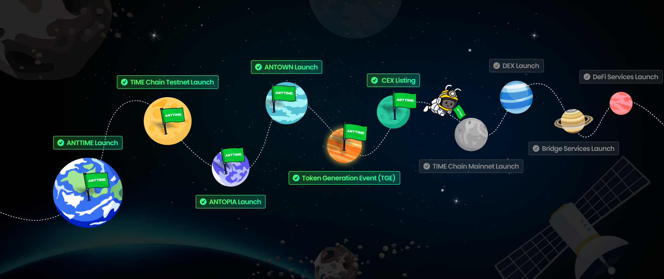 ANTTIME is continuously expanding its core infrastructure and services to realize a time-based Web3 economy. This roadmap outlines the future direction and vision for the ANTTIME ecosystem, presenting a step-by-step plan to deliver greater value to our users.