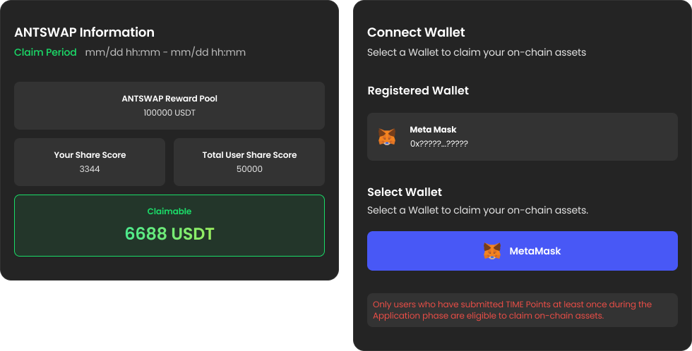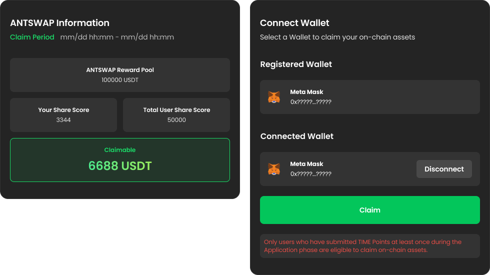 Claim the on-chain assets allocated based on your Share Score to the wallet registered during the 'Wallet Registration & Become a Timy' period. ※ Claims can only be made using the wallet registered during the 'Wallet Registration & Become a Timy' period.