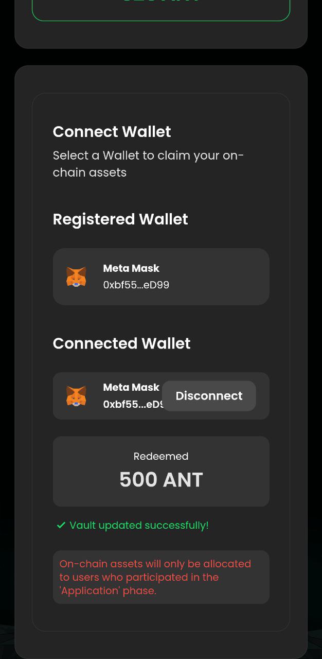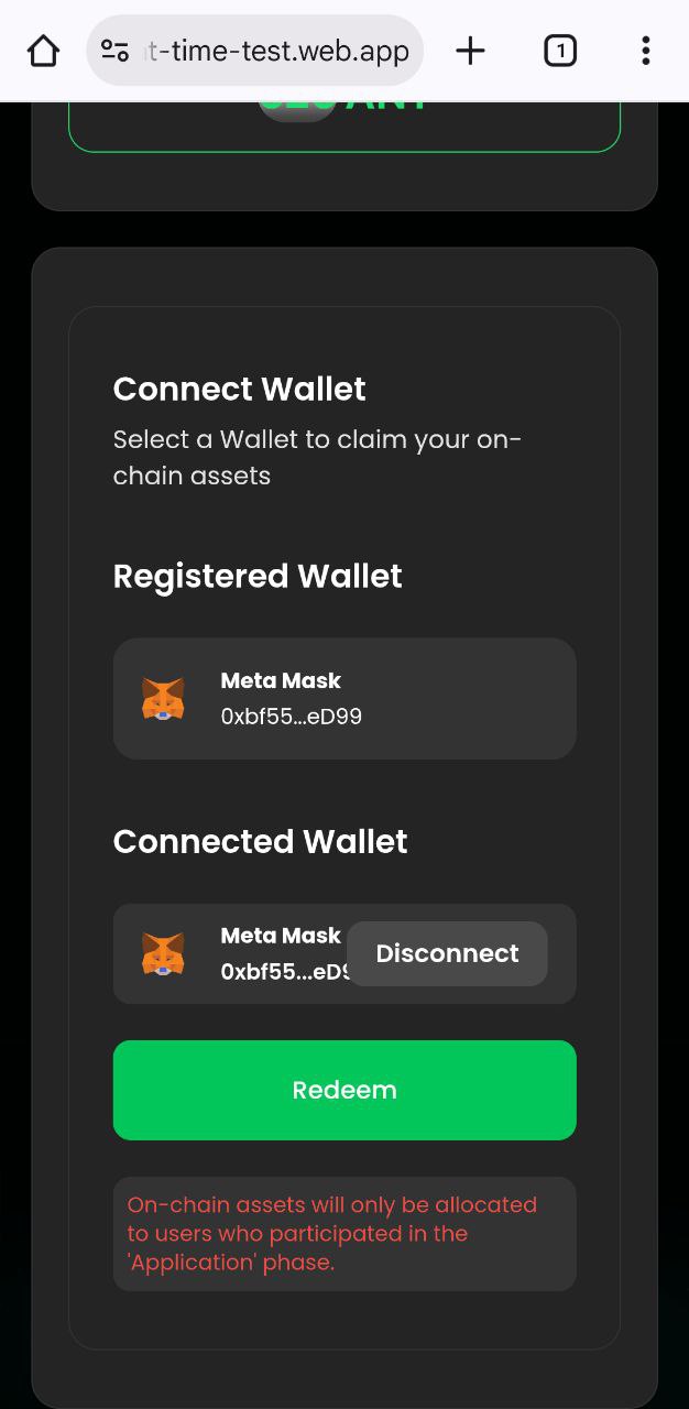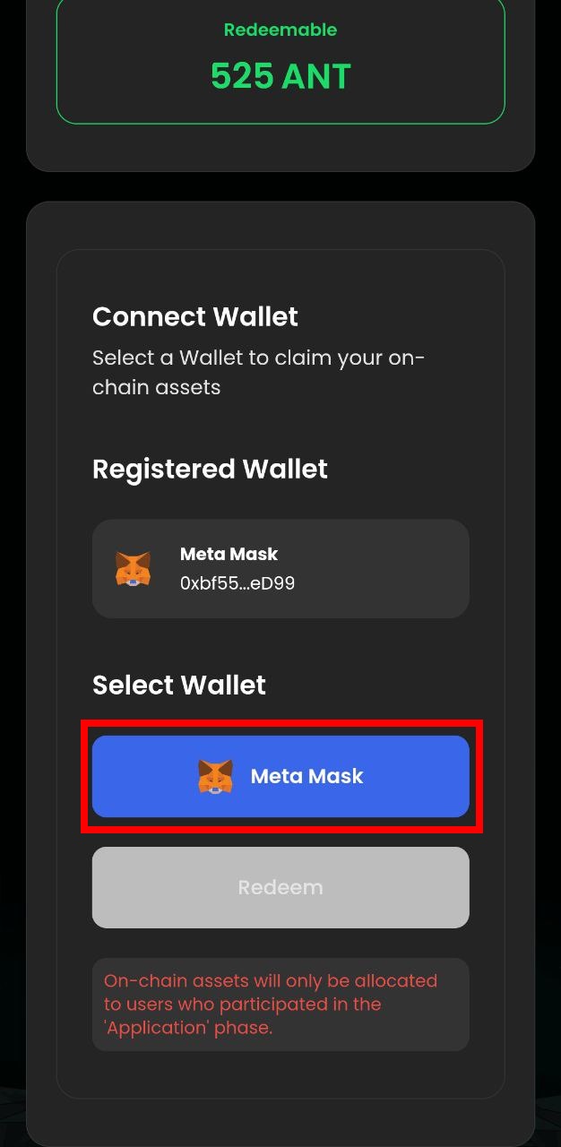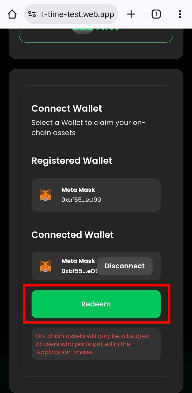 <div><figure><img src="https://content.gitbook.com/content/CKWUakdDWG316Utu9O7S/blobs/BsKKqIaIugamh3H6CR4U/redeem_wallet_connect_1.jpg" alt=""><figcaption></figcaption></figure> <figure><img src="https://content.gitbook.com/content/CKWUakdDWG316Utu9O7S/blobs/hB6amhjaT2JnuzmaK8WR/redeem_wallet_connect_2.jpg" alt=""><figcaption></figcaption></figure></div>