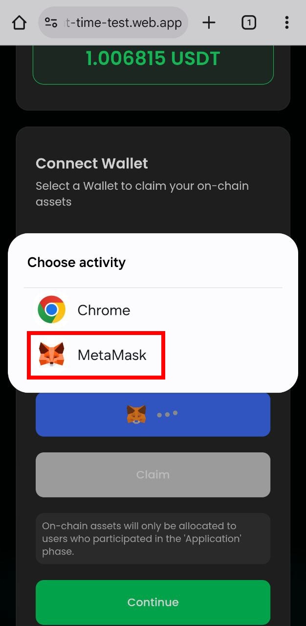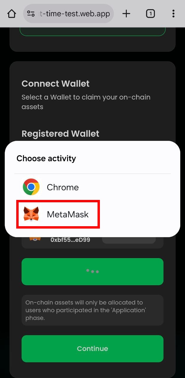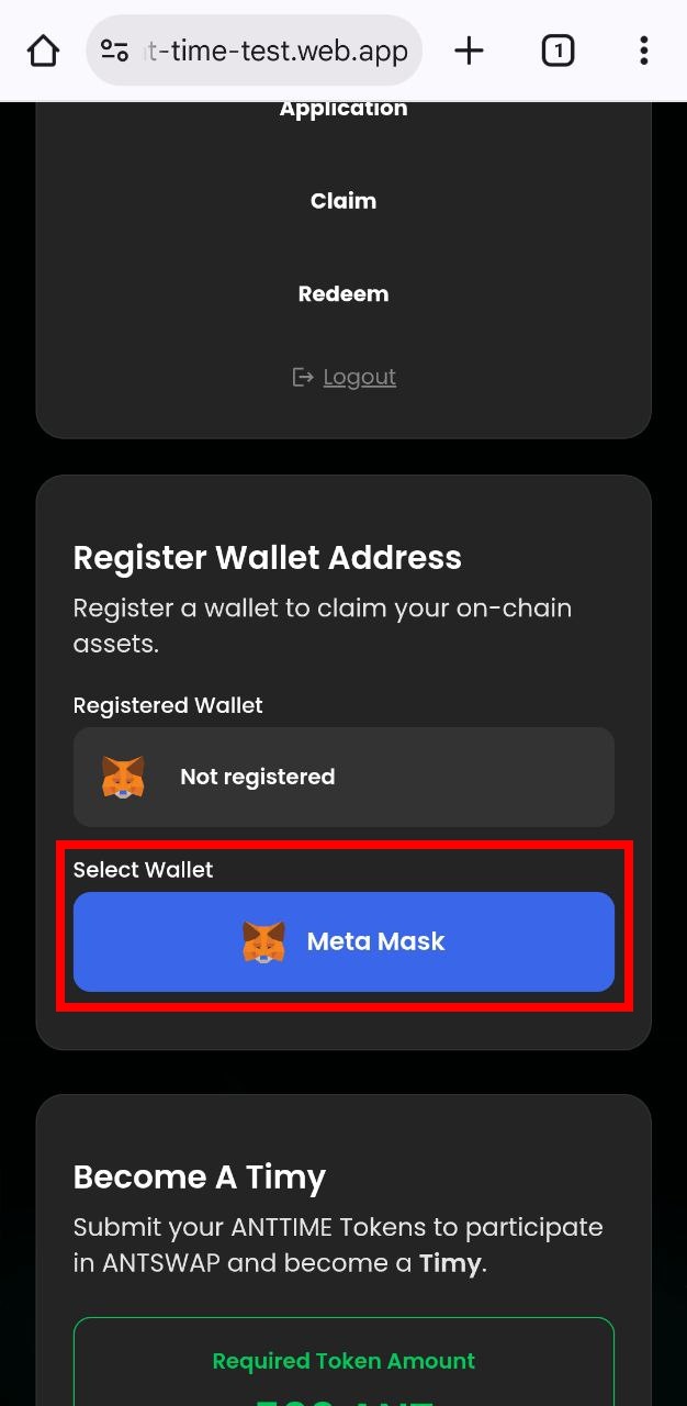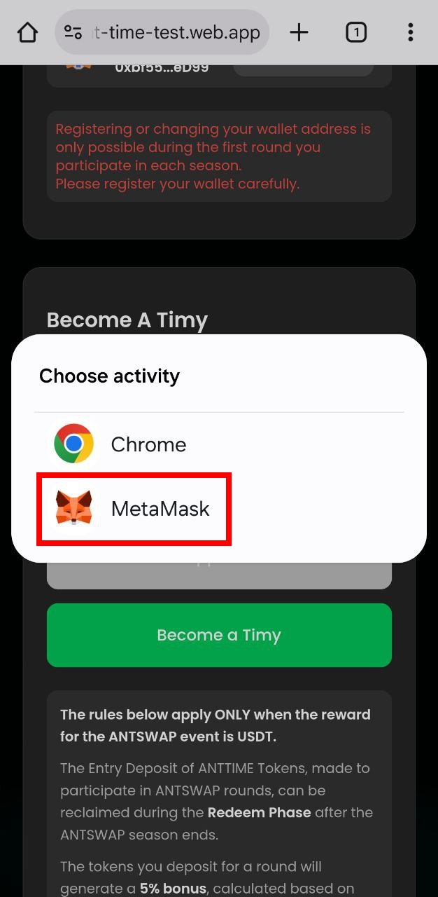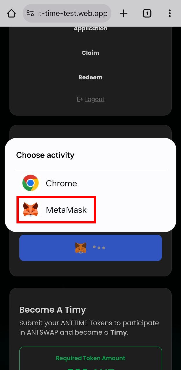 * Tap the **“Become a Timy”** button and select the **“MetaMask”** app.