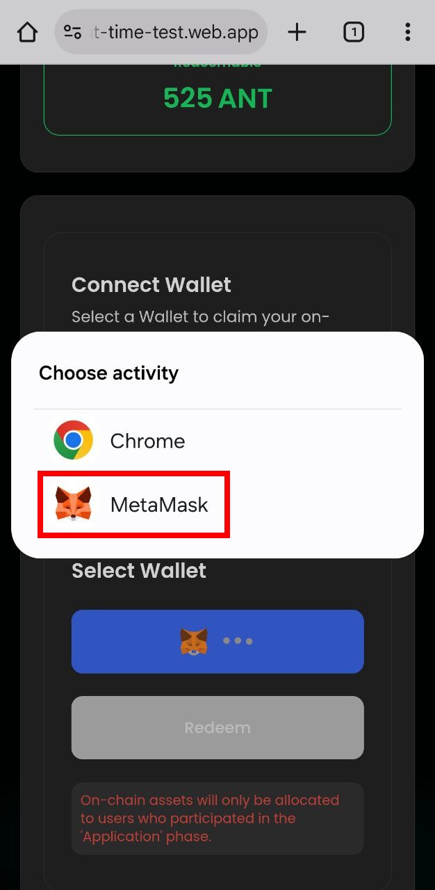 * Tap the **“Redeem”** button and select the **“MetaMask”** app.