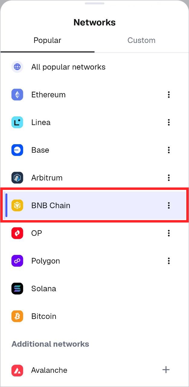 In the MetaMask interface, change the **Network** (top left) to **Binance Smart Chain (BSC)**.\ <mark style="color:red;">Before proceeding with any wallet-related step, make sure the network is set to</mark> <mark style="color:red;"></mark><mark style="color:red;">**BSC**</mark><mark style="color:red;">.</mark>\ <mark style="color:red;">We are not responsible for any issues caused by selecting a network other than</mark> <mark style="color:red;"></mark><mark style="color:red;">**BSC**</mark><mark style="color:red;">.</mark>