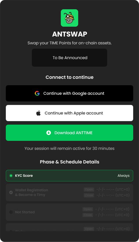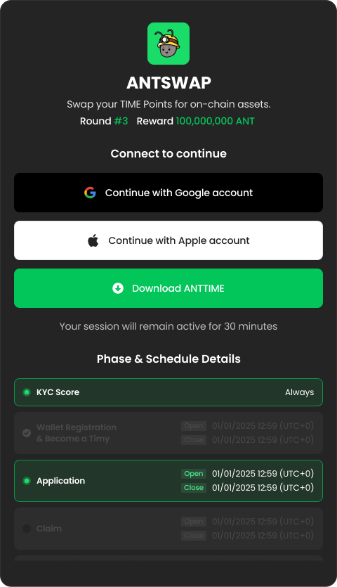 You can check information about the currently ongoing ANTSWAP round and participate using the same account you used to play ANTTIME. Please make sure to check the schedule for each participation phase carefully.