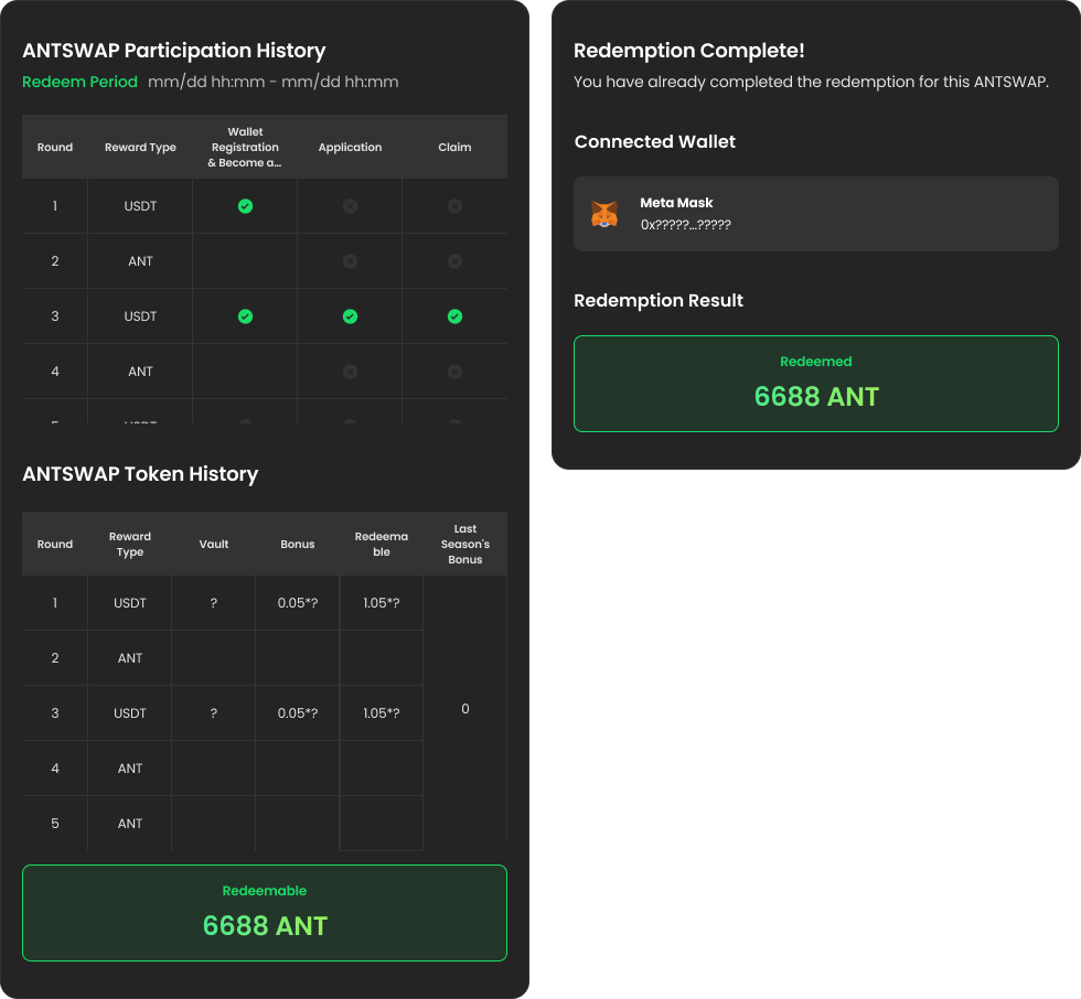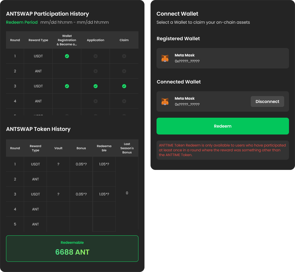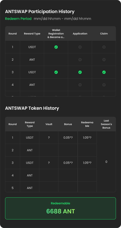 * Check the ANTTIME Token submission records for each round, the number of Bonus ANTTIME Tokens, and the Last Season’s Bonus Tokens in the ANTSWAP Token History.