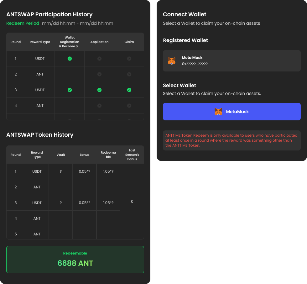 Redeem the ANTTIME Tokens submitted during the season, along with any bonuses, to the wallet registered during the **'Wallet Registration & Become a Timy'** period.\