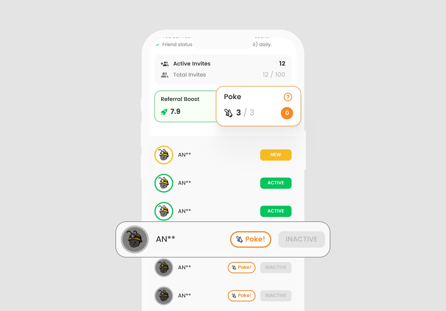 Do you want to wake up your inactive ant friends from your friend list? Use the Poke item right now to awaken your friends. Your friends will receive a Poke push notification from you and join the mining activity. Using the Poke item will immediately switch these friends to an Active state, temporarily boosting your referral boost as well.