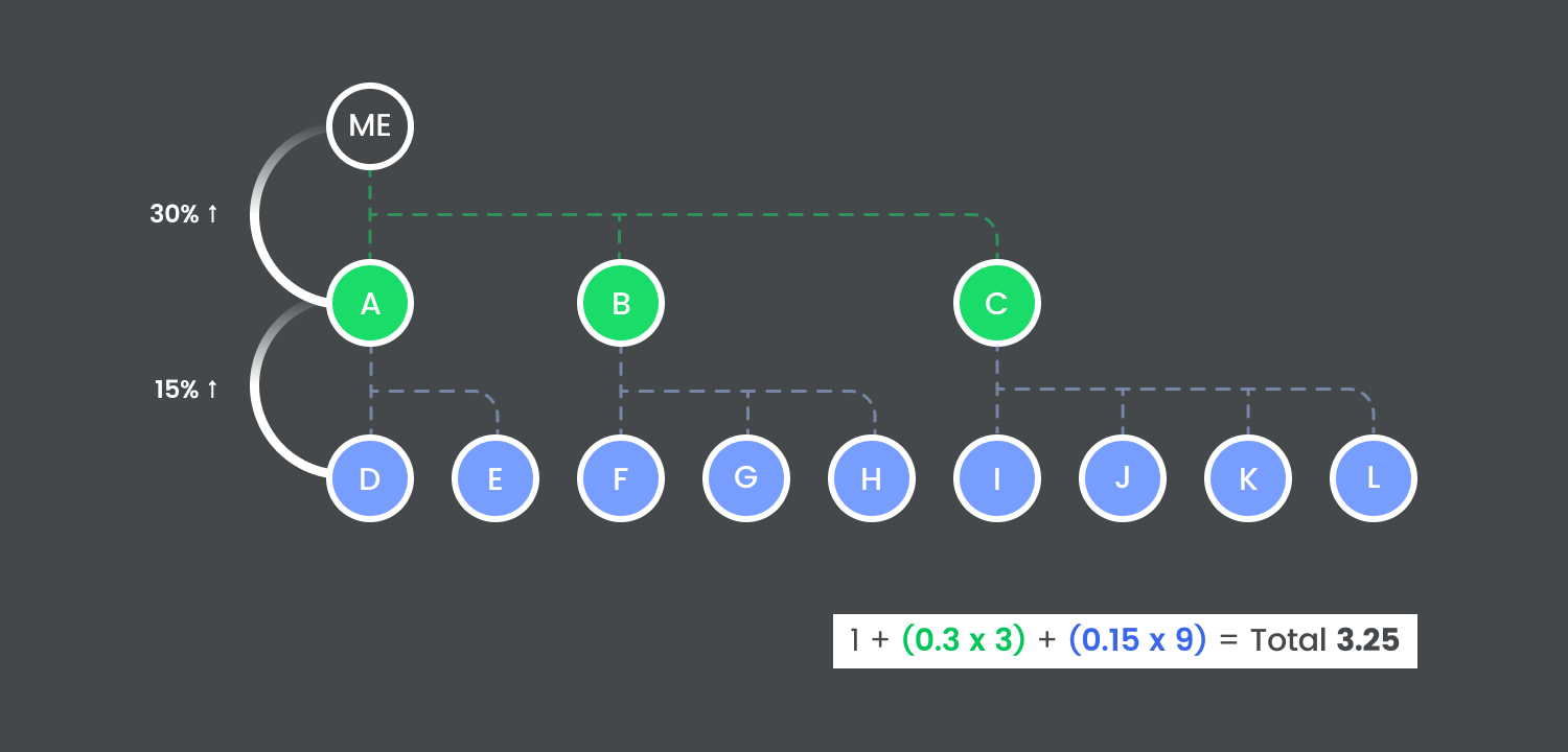 ✅ \[Example] If I have recruited 3 friends: <mark style="color:green;">**A**</mark>, <mark style="color:green;">**B**</mark>, and <mark style="color:green;">**C**</mark>, and <mark style="color:green;">**A**</mark> recruits <mark style="color:blue;">**D**</mark> and <mark style="color:blue;">**E**</mark>, <mark style="color:green;">**B**</mark> recruits <mark style="color:blue;">**F**</mark>, <mark style="color:blue;">**G**</mark>, and <mark style="color:blue;">**H**</mark>, and <mark style="color:green;">**C**</mark> recruits <mark style="color:blue;">**I**</mark>, <mark style="color:blue;">**J**</mark>, <mark style="color:blue;">**K**</mark>, and <mark style="color:blue;">**L**</mark>, then my base production rate would be **1** **+** <mark style="color:green;">**0.3 \* 3**</mark> **+** <mark style="color:blue;">**0.15 \* 9**</mark> **= 3.25.**