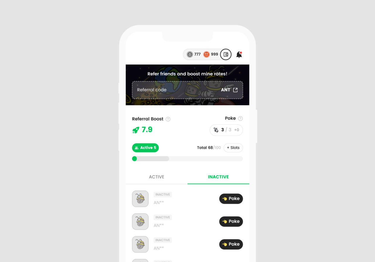 📌 *Mine and Claim activity before the second GMT+0 midnight after their registration. Afterward, they must complete at least one Mine and Claim activity before each GMT+0 midnight. If they fail to do, their account will be marked as "Inactive," and their inviter will no longer receive the production efficiency benefits from that user and their friends.*