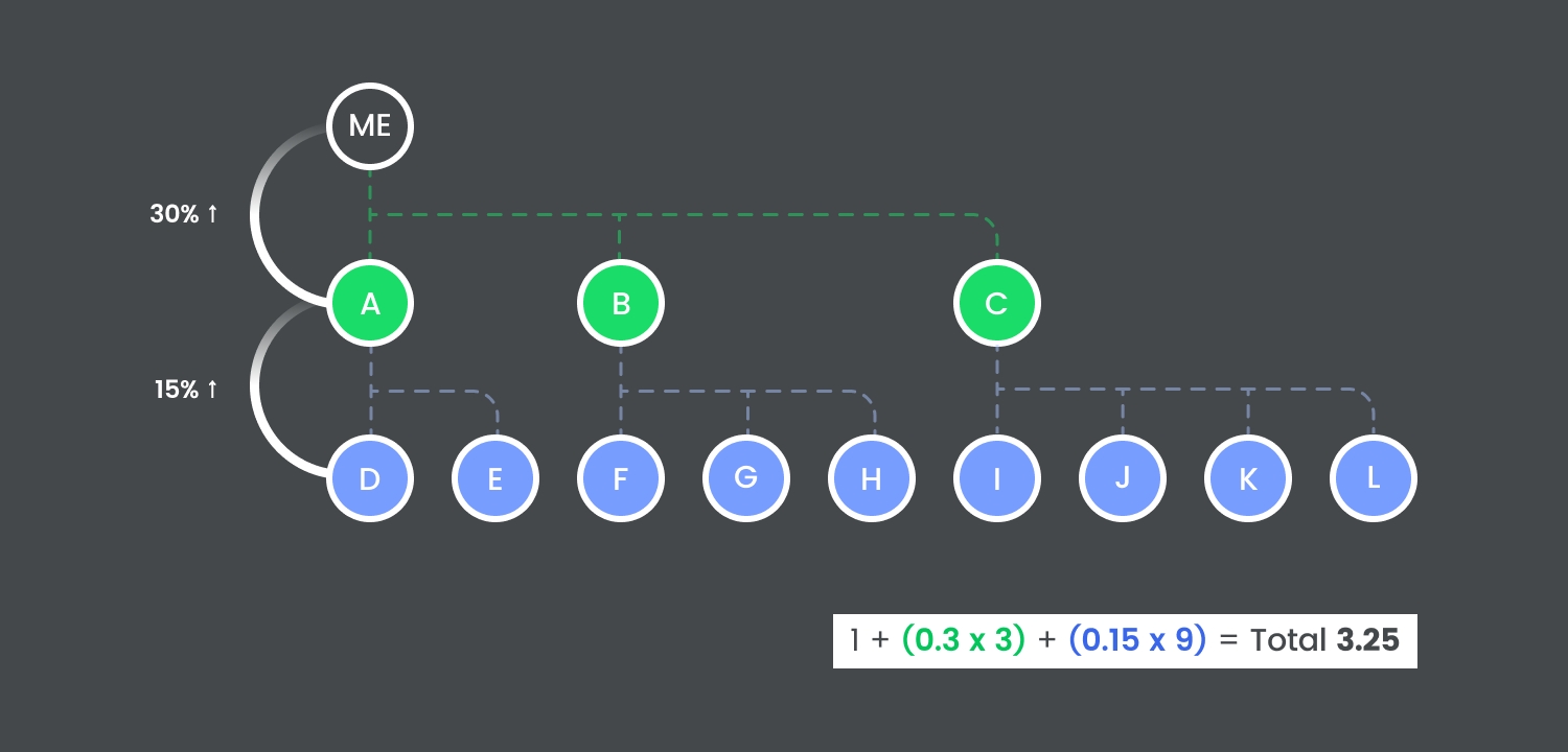 ✅ [Example] If I have recruited 3 friends: A, B, and C, and A recruits D and E, B recruits F, G, and H, and C recruits I, J, K, and L, then my base production rate would be 1 + 0.3 * 3 + 0.15 * 9 = 3.25.