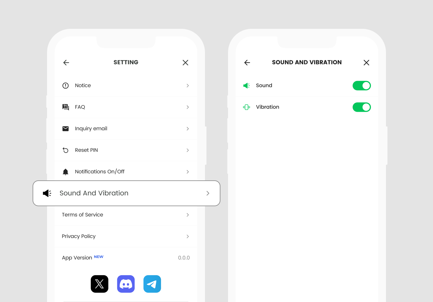 You can turn the vibration on or off. Sound will be enabled in a future app update.