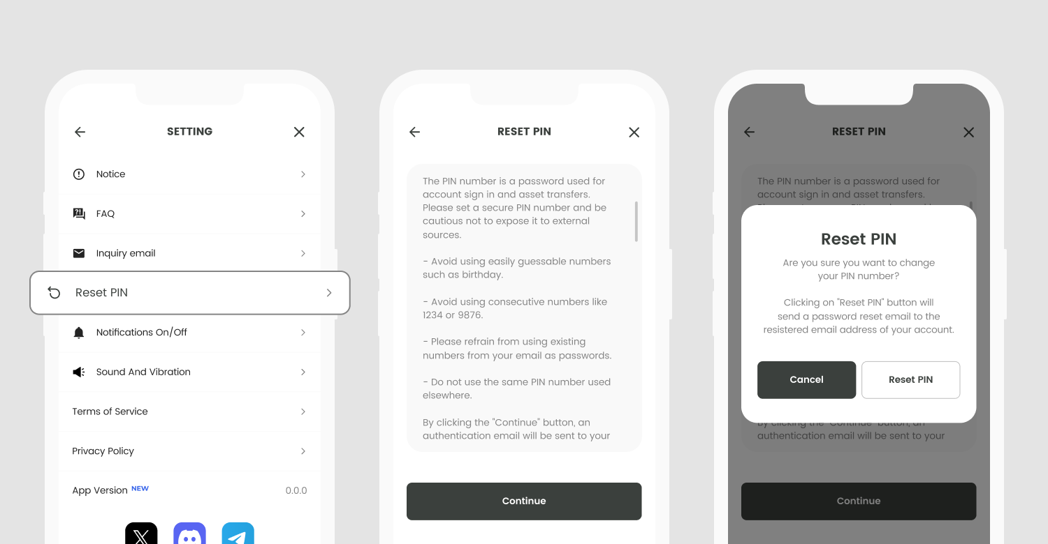 By clicking on the "Reset PIN" button, you can set a new PIN number. An authentication email will be sent to the email address associated with your account. Please check your inbox and click on the link provided in the email to proceed with setting a new PIN number.