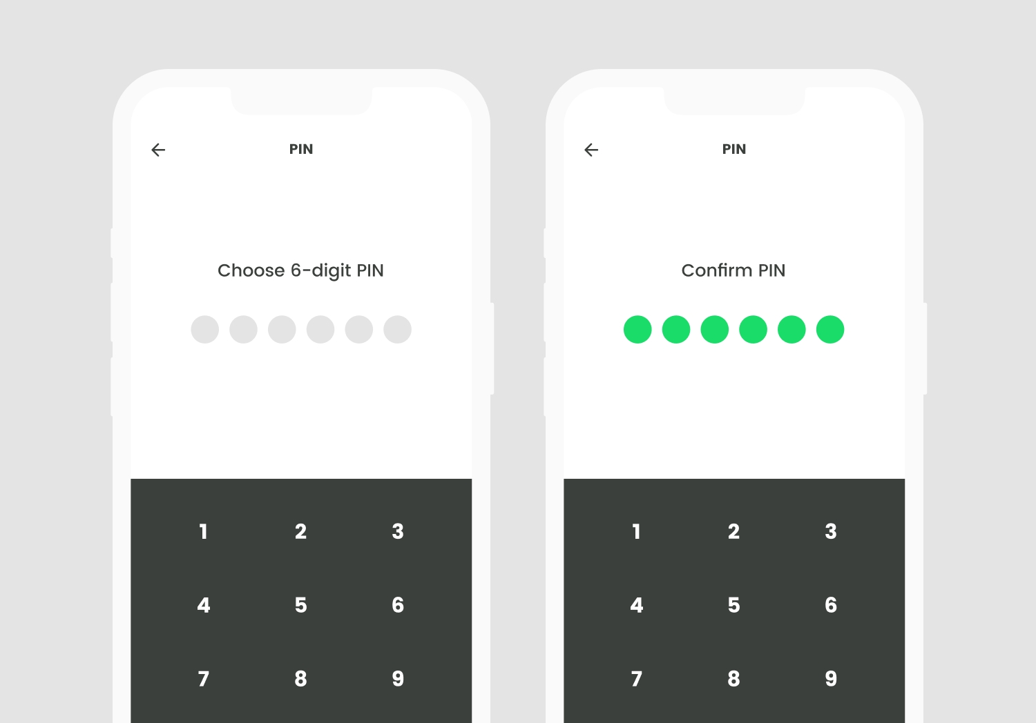 Setting up your 6-digit PIN number. Please enter your desired PIN number and confirm it again. Your PIN number will be used for activities such as wallet access and item purchases. Please be careful not to disclose your password.