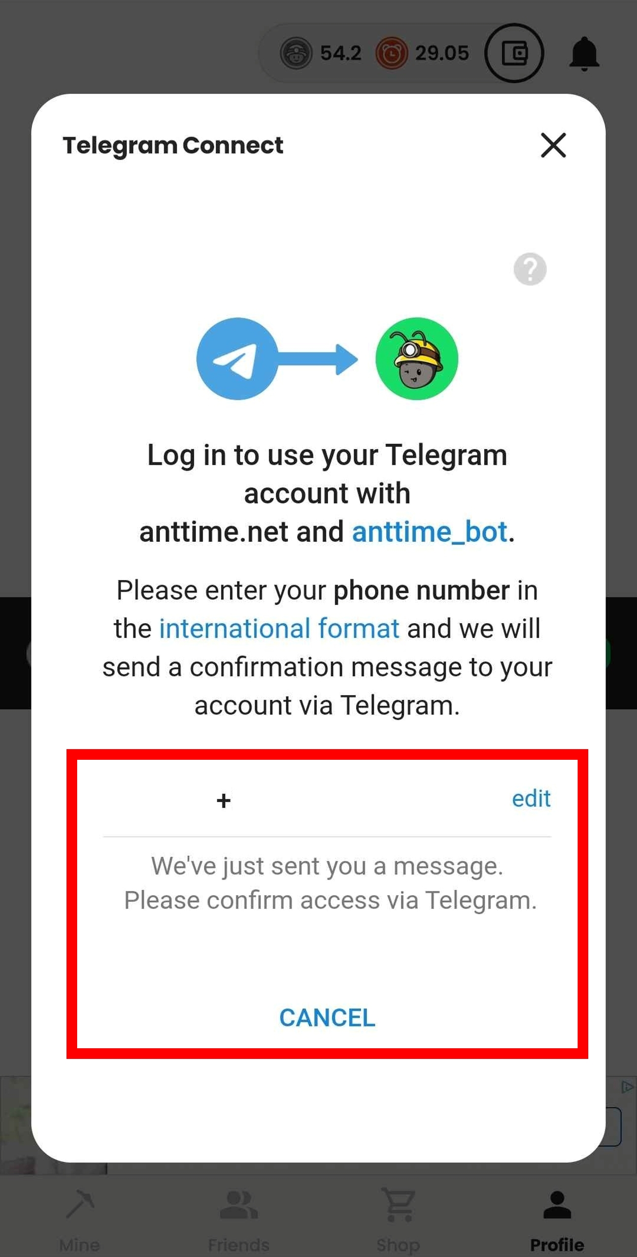 When prompted with the approval screen (see attached image), access your Telegram account and approve the connection with ANTTIME.