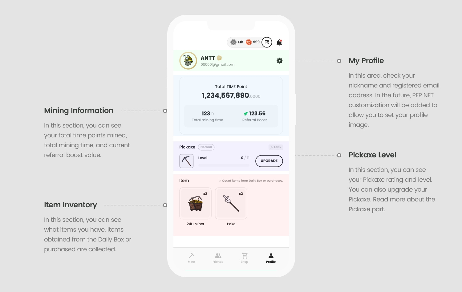 In this section, you can see your total time points mined, total mining time, and current referral boost value.