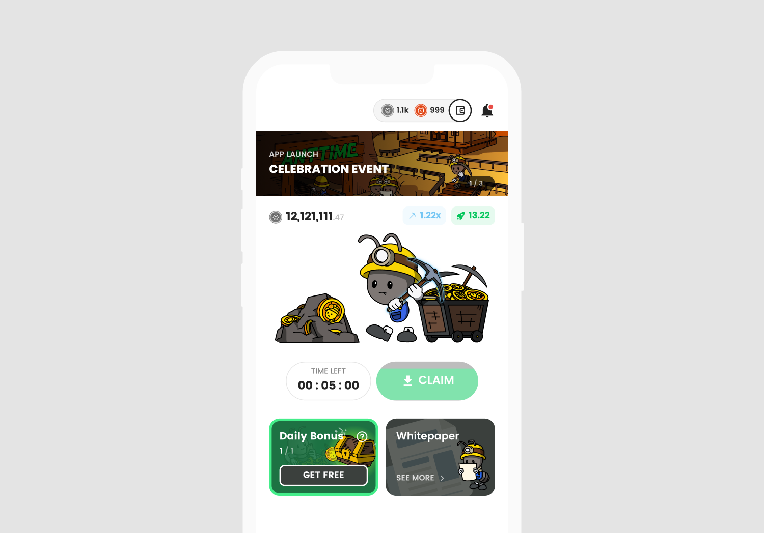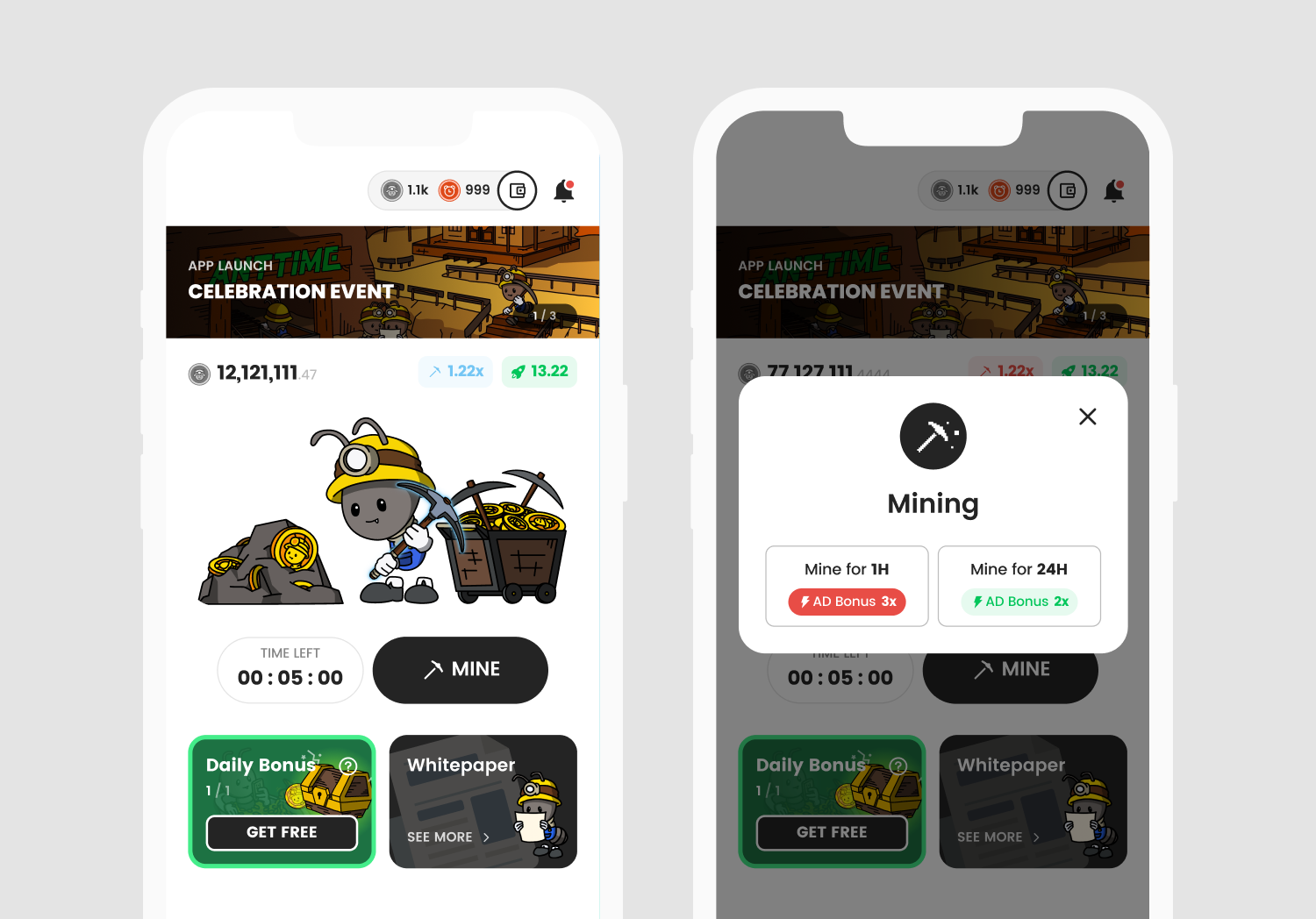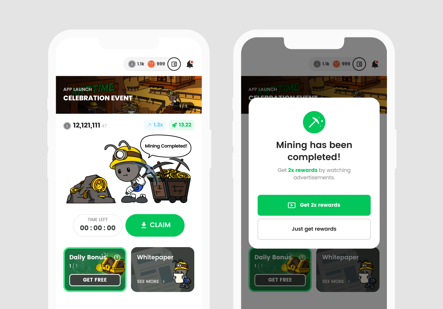 When MINE for the selected time ends, you will receive a Claim notification and the Claim button will be activated. When claiming 1H Mine, 3x ad bonus is applied, and for 24H Mine, 2x ad bonus is applied.