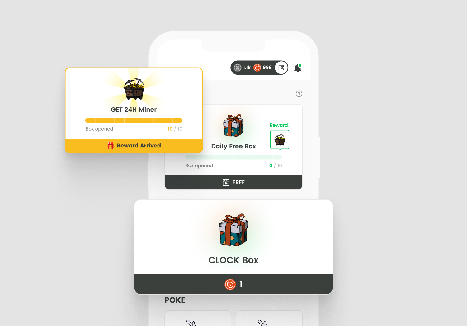 The Free Box is a reward box that can be opened up to 10 times per day. Users can open the Free Box to receive either 1 to 3 CLOCKs or 1 to 3 Poke items. Specifically, if users open all 10 of the daily allocated Free Boxes, users will receive additional "24H Miner".