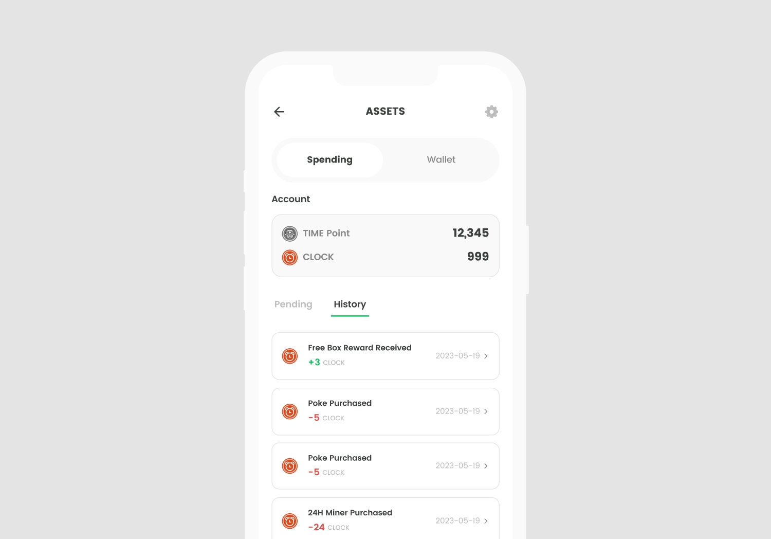 Spending is a key function within the ANTTIME app that allows you to utilize your assets. All asset usage history can be viewed within the app, and Spending is directly linked to your account.