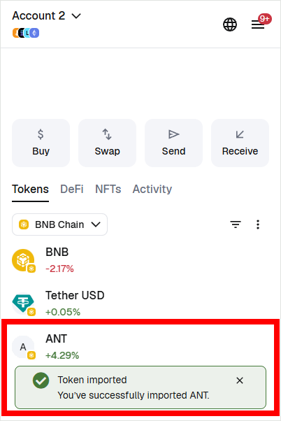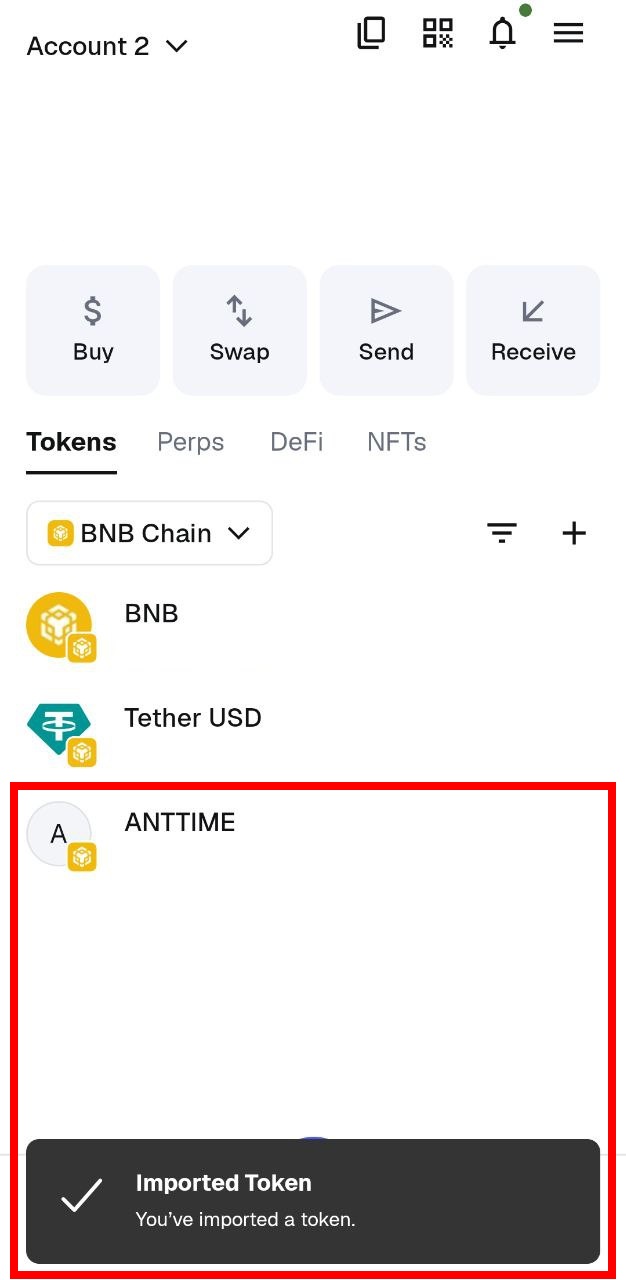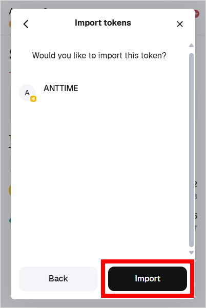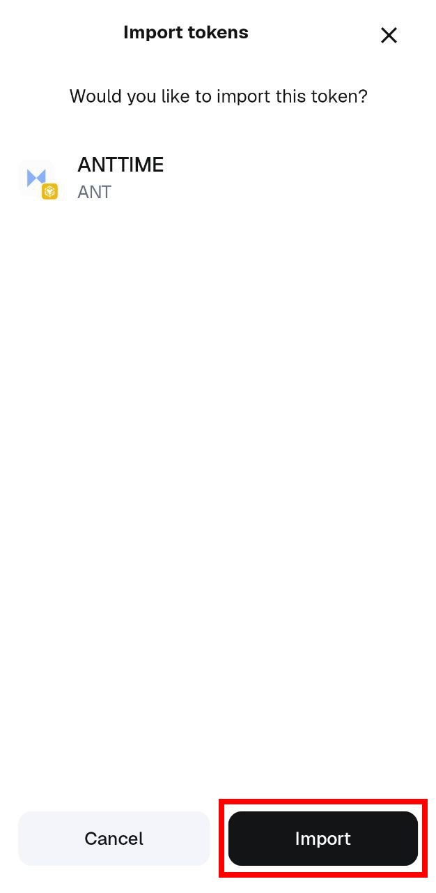 You will see an **"Imported Token"** message, and the ANTTIME Token will be added to the bottom of your Token List. You can now check your ANTTIME Token balance and make transfers.