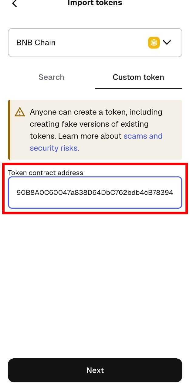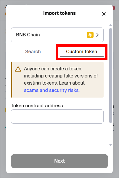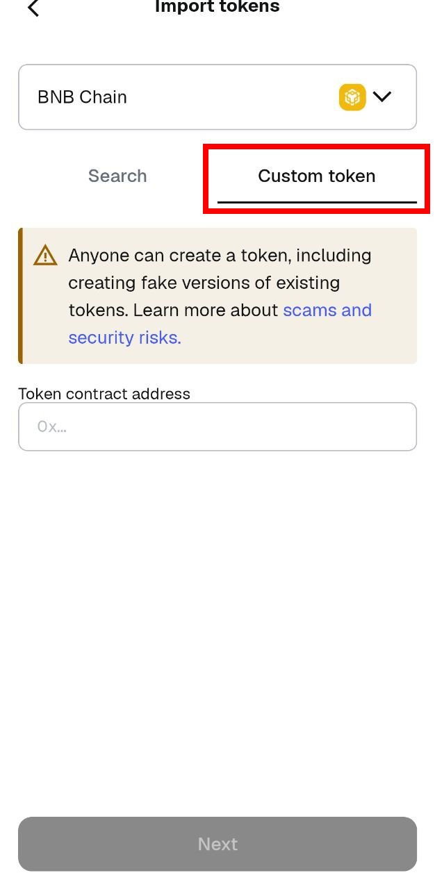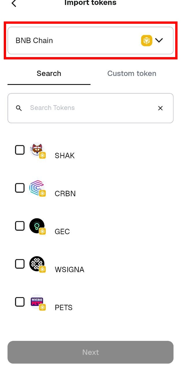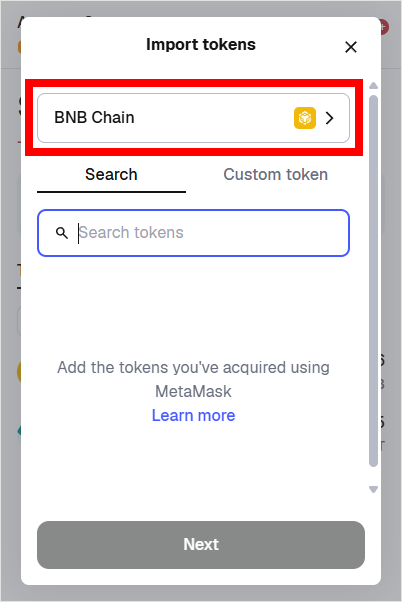 Select the chain where you want to add the token. Since the ANTTIME Token is issued on the BNB Chain, please make sure to select BNB Chain.