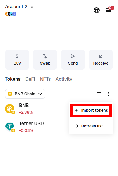 Click the "Import tokens" button (usually located at the bottom of the list).