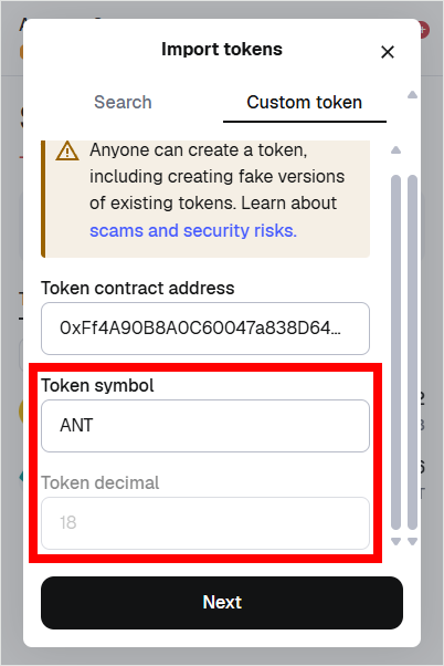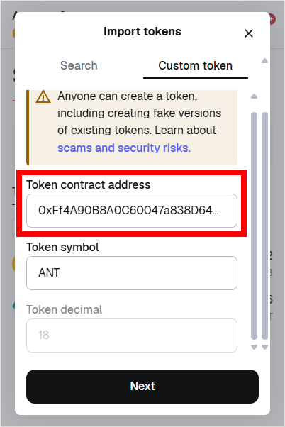 The ANTTIME Token may not appear in the standard search results. Therefore, please select the **"Custom token"** tab.
