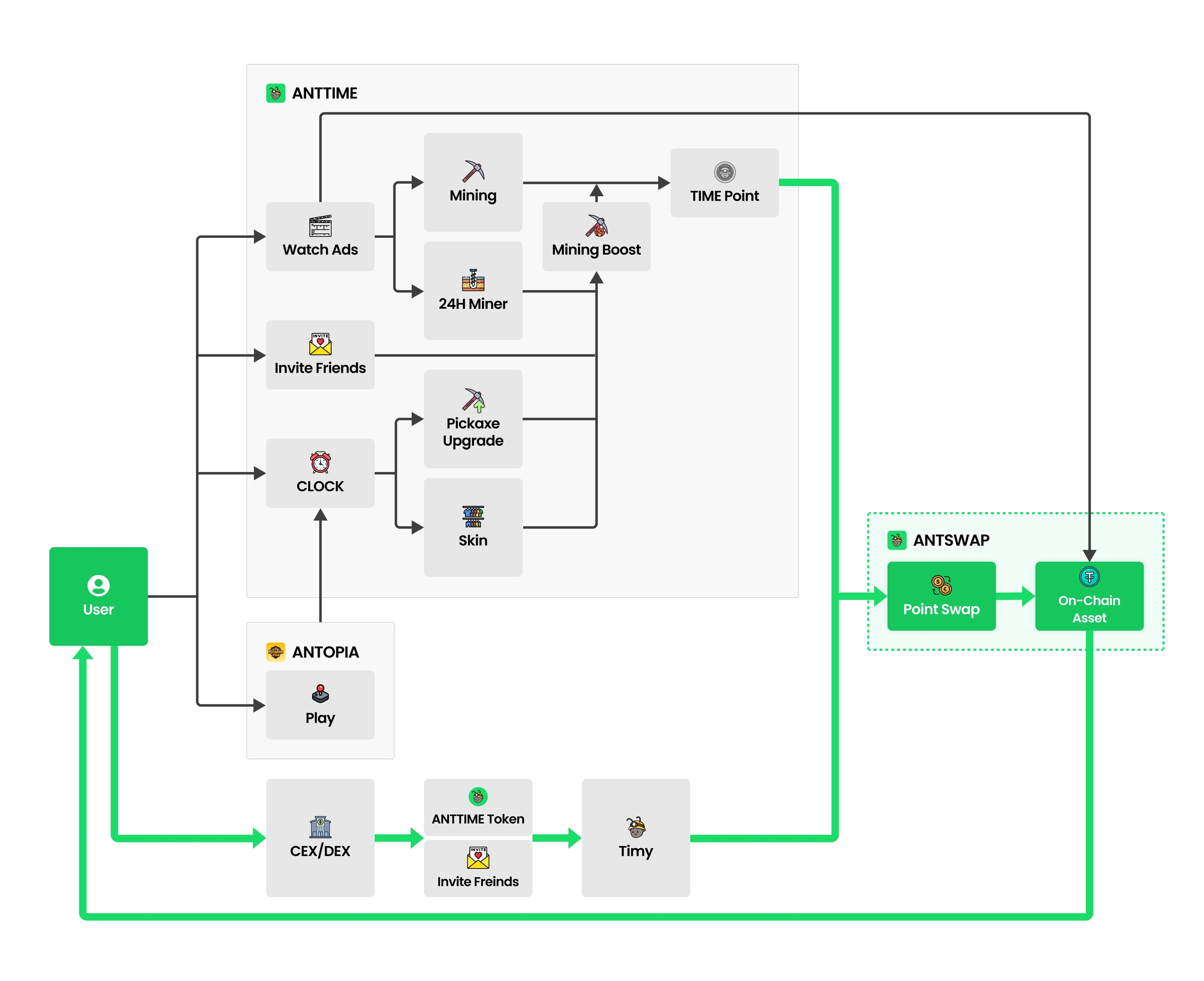 The ANTTIME Ecosystem is built around a circular Web3 mining economy, centered on various in-app assets and points such as TIME Point and CLOCK. Each product is organically connected, ensuring that user activities directly translate into asset accumulation and utility within the ecosystem.
